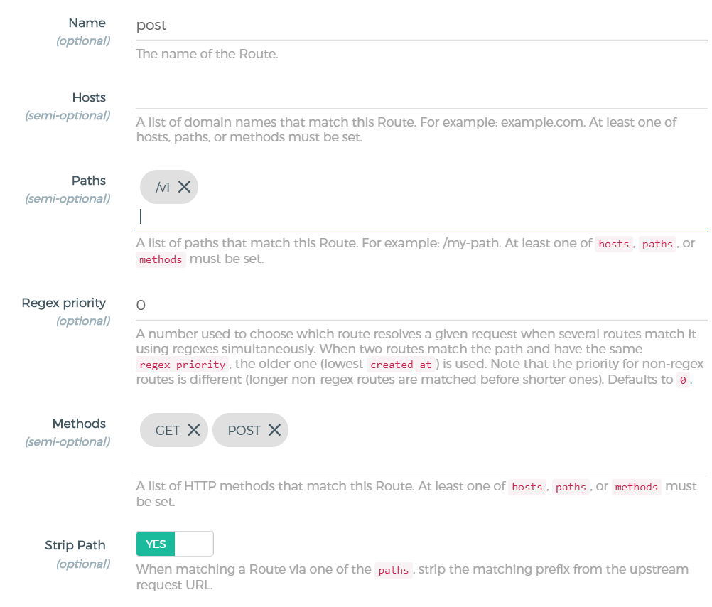 主要是 paths 和 methods,paths 是匹配的路径,我这里写的/v1,methods 允许 GET 和 POST