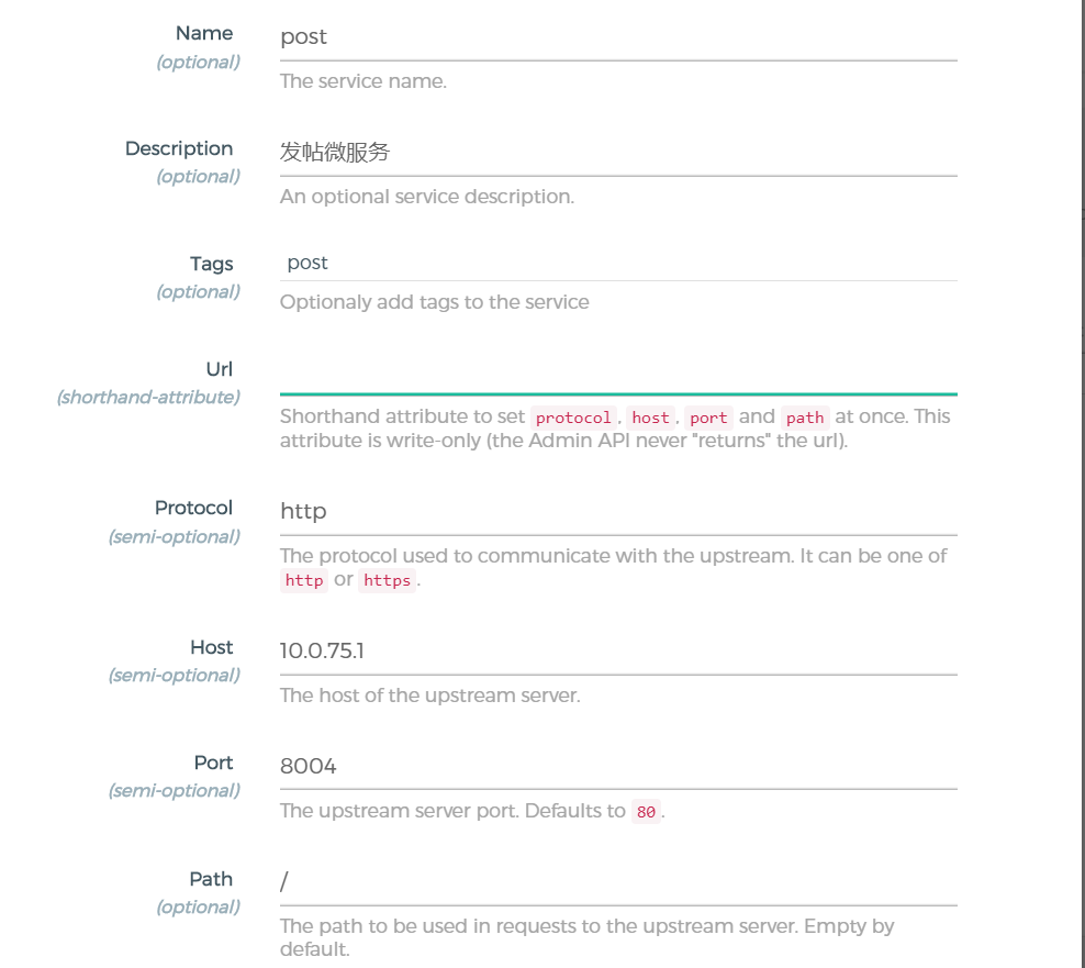 后面的默认就行,Url 可以为空,如果写的话可以写:http://10.0.75.1:8004/,添加后其实会自动分解成下面的选项(这里帖子服务的端口和我kong admin 的端口冲突了,所以我改成了 8004)