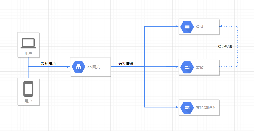 通过同一个入口,然后根据 api 的路径访问不同的微服务.顺便尝试自己做了张图,emm 感觉很差,当我们这一节结束后,我们的架构大概就是下面这样了,就像是对外一个统一的接口.