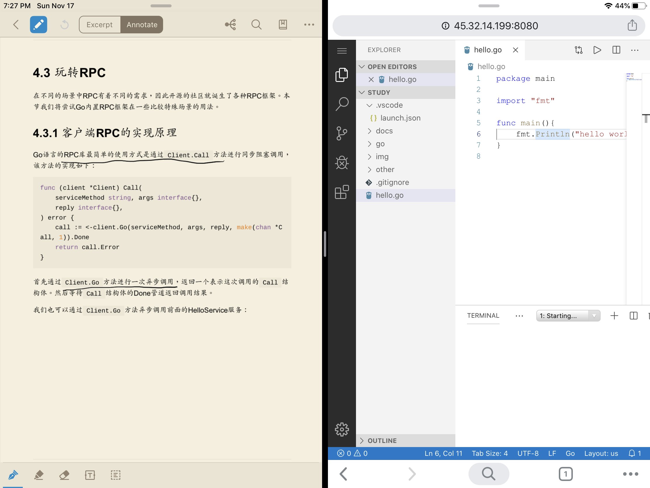 今天拿 ipad 看书的时候,想到之前看到的一个文章说可以在浏览器上使用 vscode,而且看书的时候,牵扯到一些函数的参数和具体描述无法知道(难查文档),就想能不能整一个这样的环境,一边看书也可以一边去浅度的了解里面使用的方法,也可以写代码进行调试.
